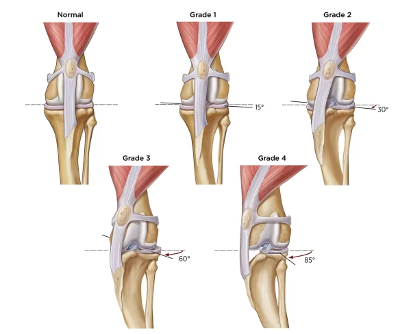 🔷 Luxating patella is graded from 1 to 4 based on severity: